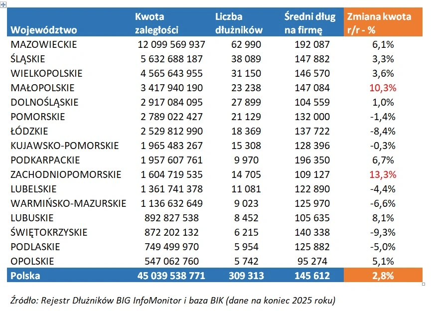 Z danych BIG InfoMonitor wynika, że najwyższe średnie zadłużenie ponad 190 tys. zł na firmę odnotowano w województwach podkarpackim i mazowieckim. Jednocześnie wartościowo Mazowsze pozostaje zdecydowanym liderem zadłużenia (12 mld zł), a kolejne miejsca zajmują Śląsk (ponad 5,6 mld zł) oraz Wielkopolska (4,6 mld zł).