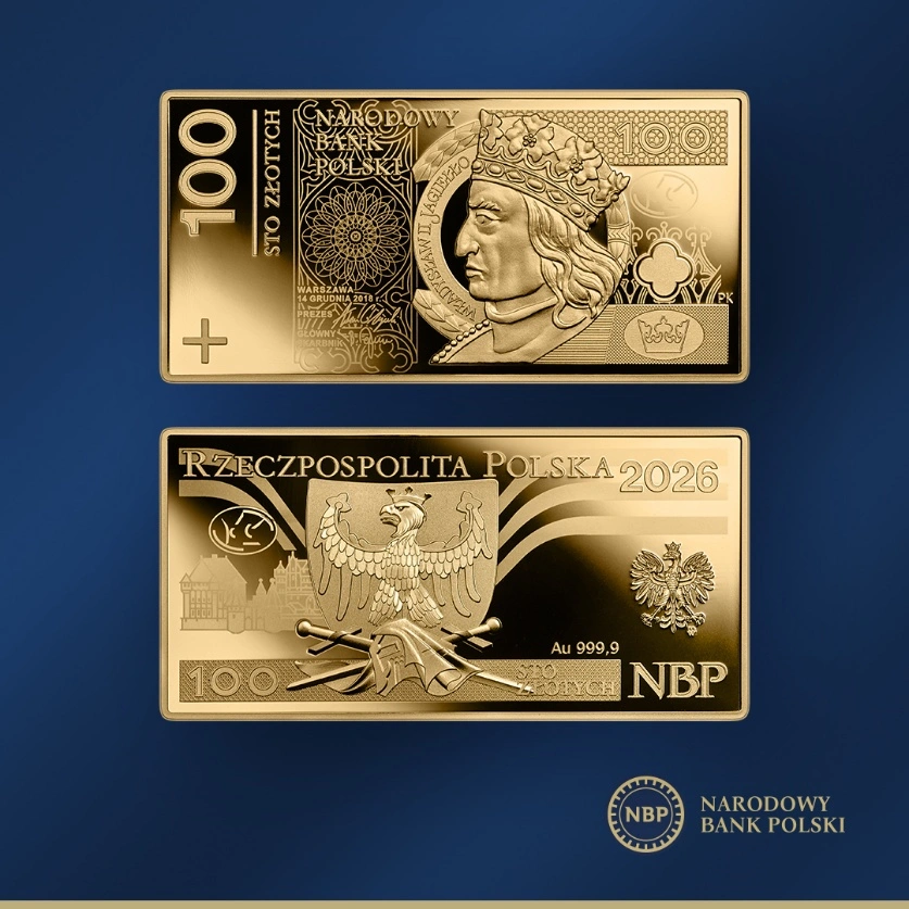 Od poniedziałku, 9 lutego będą dostępne w sprzedaży złote monety kolekcjonerskie „Banknot o nominale 100 zł” - informuje Narodowy Bank Polski.