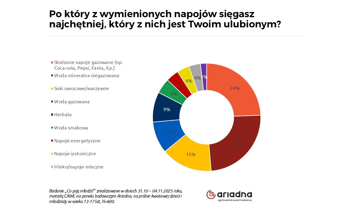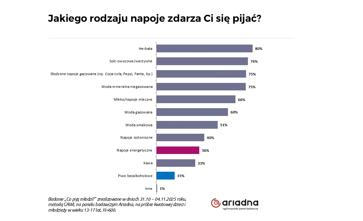 Przeprowadzone w listopadzie 2025 roku badanie Ogólnopolskiego Panelu Badawczego Ariadna miało na celu poznanie zwyczajów i preferencji konsumenckich młodzieży w wieku 13-17 lat wobec różnego rodzaju napojów. Jego wyniki w kilku punktach okazały się zaskakujące, przecząc wielu opiniom obecnym w przestrzeni publicznej.