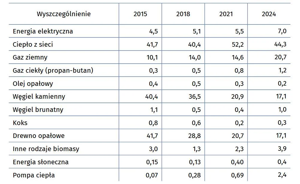 Największą zmianą w tabeli jest jednak spadek udziału ciepła z sieci. W 2021 r. było ono wykorzystywane do ogrzewania ponad połowy mieszkań w kraju, a w 2024 r. już przez 44,3 proc. gospodarstw domowych. GUS podkreśla przy tym, że sieć ciepłownicza nadal dominuje w dużych miastach i w zabudowie wielorodzinnej, a spadek udziału to w dużej mierze efekt zmian strukturalnych – rozwoju budownictwa jednorodzinnego i dywersyfikacji źródeł ciepła.