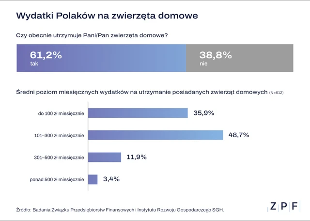 W badaniu sytuacji finansowej gospodarstw domowych „Sytuacja na rynku consumer finance” prowadzonym przez Związek Przedsiębiorstw Finansowych w Polsce (ZPF) oraz Instytut Rozwoju Gospodarczego Szkoły Głównej Handlowej (IRG SGH) Polacy zostali zapytani o wydatki na utrzymanie zwierząt domowych, którymi się opiekują.