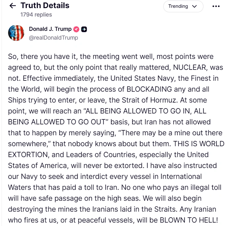 Ze skutkiem natychmiastowym Marynarka Wojenna Stanów Zjednoczonych, Najlepsza na Świecie, rozpocznie proces blokady wszelkich statków próbujących wpłynąć do Cieśniny Ormuz lub ją opuścić – napisał na swoim portalu Truthsocial.com prezydent USA.