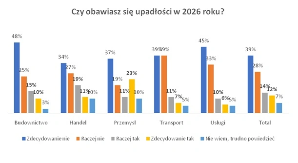 Jednocześnie aż 26 proc. firm obawia się, że w 2026 roku zakończy działalność. To znacznie więcej niż w 2022 roku, kiedy o możliwym zamknięciu biznesu informowało 15 proc. badanych - wzrost o 11 pkt proc. Producenci stanowią największą część tej grupy, bo co trzeci z nich informuje o takim ryzyku. Wysoki udział obaw mają też reprezentanci handlu – 30 proc. oraz budownictwa – 25 proc.