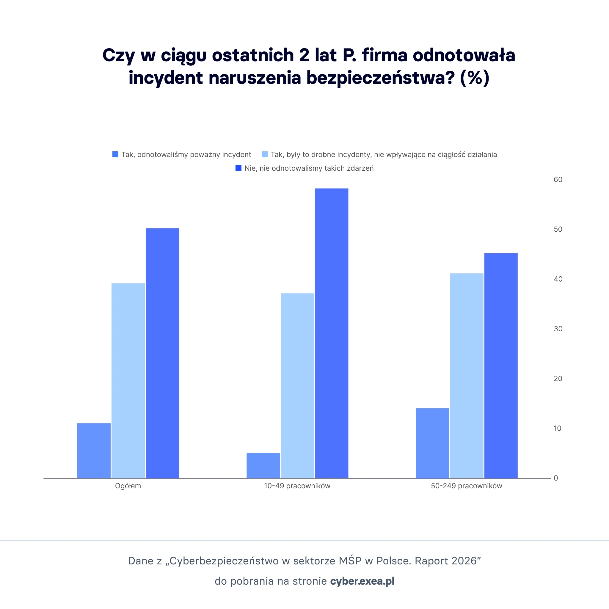 Najmocniejsza liczba w raporcie jest jednak inna. Połowa badanych firm odnotowała incydent naruszenia bezpieczeństwa w ciągu ostatnich 24 miesięcy. W grupie średnich przedsiębiorstw poważne zdarzenia wskazało 14 proc. podmiotów.
