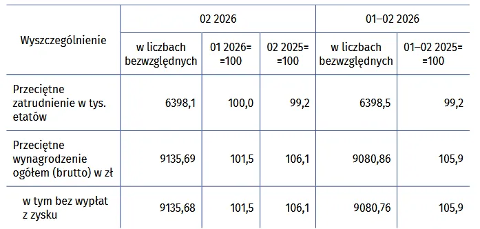 Przeciętne miesięczne wynagrodzenie brutto w sektorze przedsiębiorstw w lutym 2026 r. było wyższe o 1,5 proc. niż w styczniu br. i wzrosło nominalnie o 6,1 proc. w porównaniu z lutym 2025 r.
