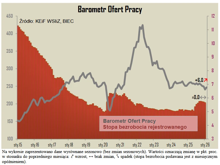 Barometr Ofert Pracy jest wskaźnikiem wyprzedzającym dla rynku pracy – zmiany liczby publikowanych ogłoszeń często pojawiają się wcześniej niż zmiany zatrudnienia czy bezrobocia. Dlatego lutowe odbicie może być pierwszym sygnałem poprawy sytuacji, ale równie dobrze tylko chwilową przerwą w dłuższym okresie schłodzenia rynku pracy.