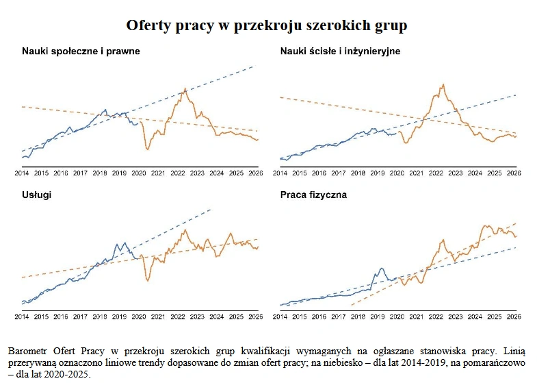 W sektorach technicznych widać umiarkowane ożywienie. Najwięcej nowych ogłoszeń pojawiło się dla informatyków, pracowników badań i rozwoju oraz inżynierów. Autorzy raportu podkreślają jednak, że liczba ofert w tych zawodach wciąż pozostaje wyraźnie niższa niż średnia z poprzednich lat.