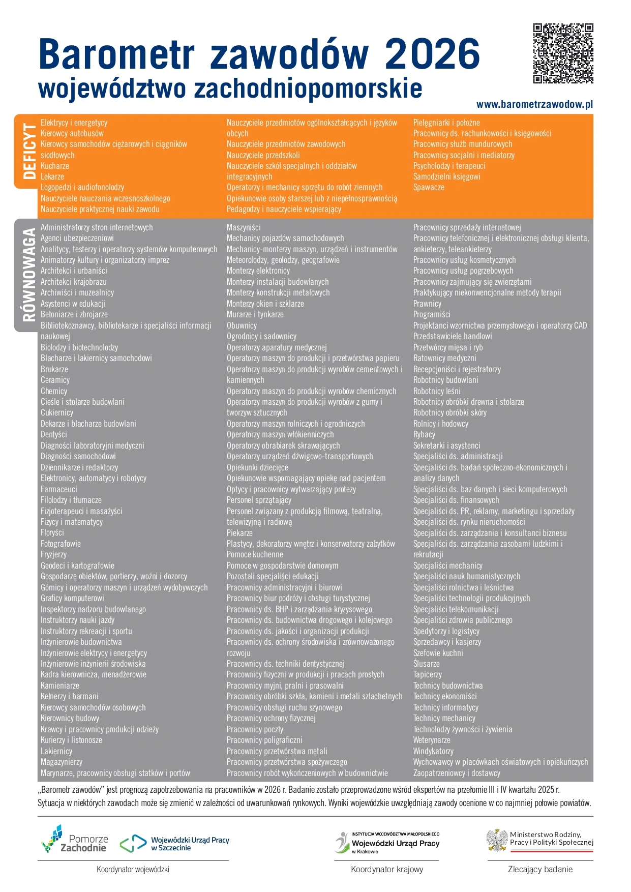 W zestawieniu na 2026 r. w skali Polski znalazło się 17 grup zawodów deficytowych (w tamtym roku było ich 23), w tym elektrycy i energetycy, kierowcy autobusów i ciężarówek, magazynierzy, monterzy instalacji budowlanych. Potrzeba też lekarzy, psychologów i terapeutów, nauczycieli, pielęgniarek, pracowników służb mundurowych, spawaczy, księgowych, opiekunów osób starszych. Natomiast sytuacja może różnić się w zależności od województwa. Dla wszystkich regionów przygotowano odrębne zestawienia.
