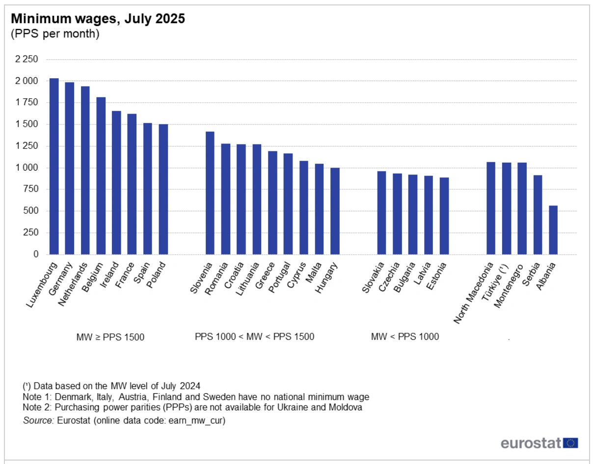Eurostat generalnie dzieli kraje UE na trzy grupy i w tej najwyższej poza tymi trzema krajami z podium są jeszcze Niemcy, Belgia i Francja. We wszystkich tych krajach pensja minimalna przekracza 1500 euro.