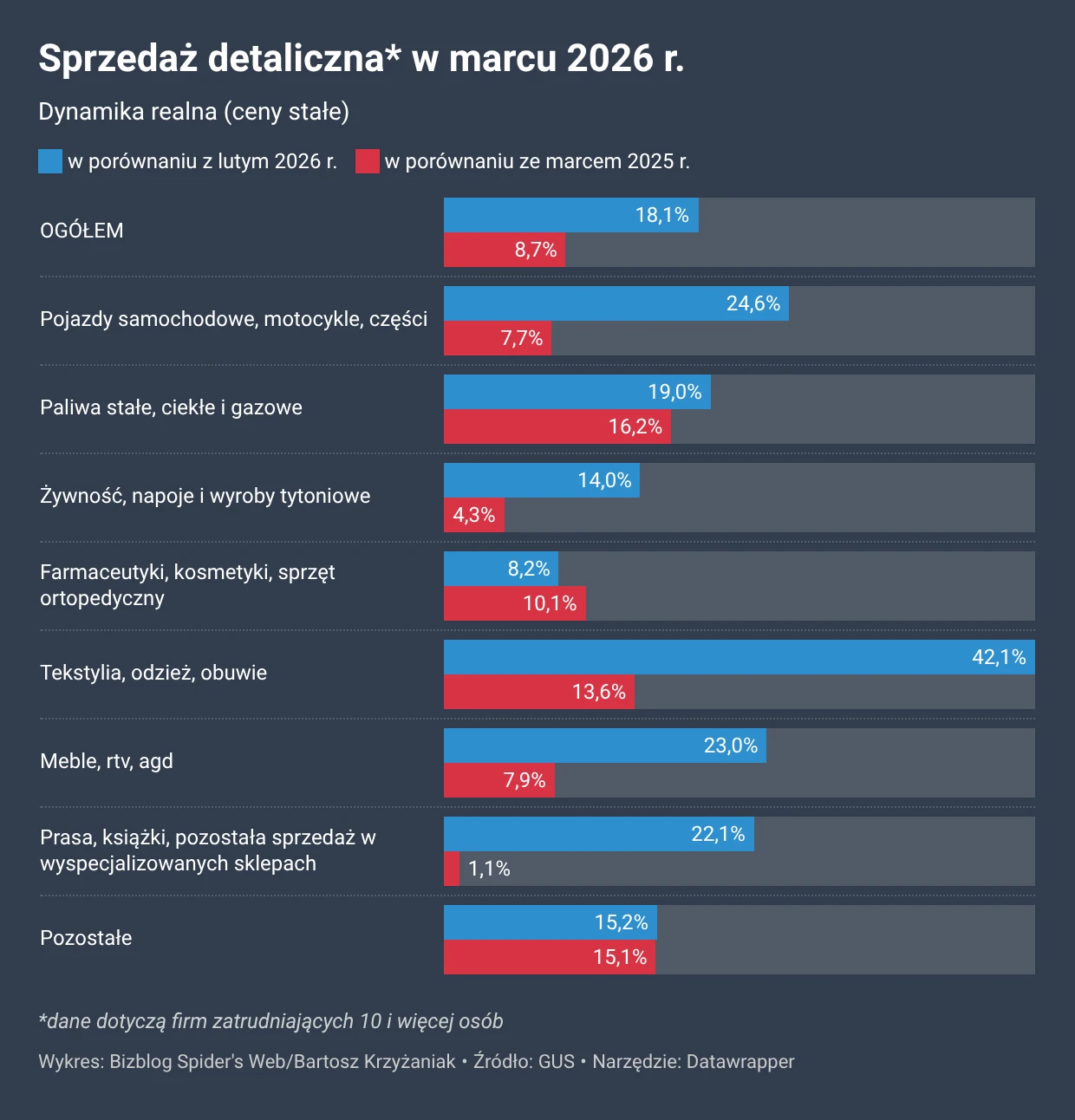 W marcu 2026 r. odnotowano wysoki wzrost sprzedaży detalicznej r/r, na który wpływ miała m.in. wcześniejsza data Świąt Wielkanocnych w br. i związana z tym większa liczba dni handlowych (niedziela handlowa) w porównaniu z marcem 2025 r. – czytamy w komunikacie GUS.