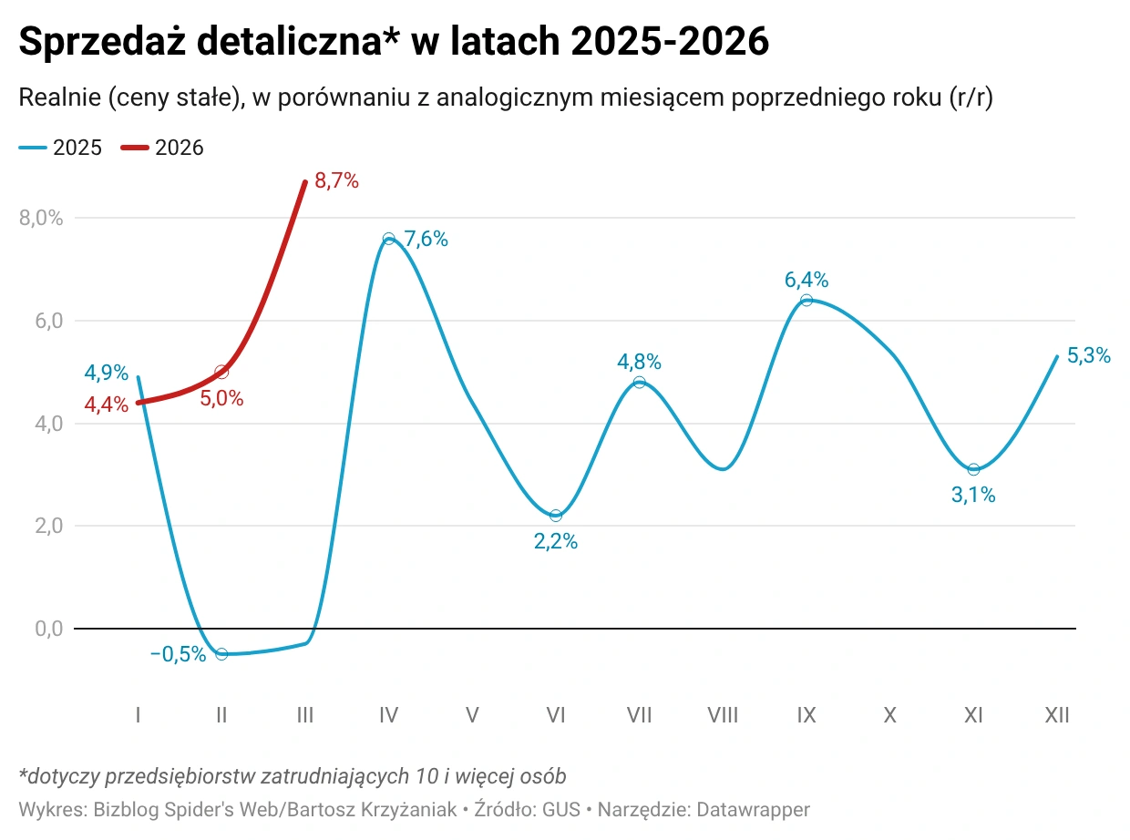 Po rozczarowujących rynek danych o rozmiarach lutowej sprzedaży detalicznej w Polsce, która zwiększyła się w rok o 5 proc., marzec przyniósł oczekiwaną poprawę. Według najnowszych danych Głównego Urzędu Statystycznego w marcu sprzedaż odbiła do 8,7 proc. wobec marca 2025 r. (r/r). Mówimy o ujęciu realnym, czyli uwzględniającym inflację (ta, przypomnijmy, wzrosła w marcu z 2,1 proc. do 3 proc. r/r).