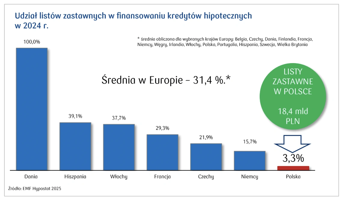 Rekordzistą jest Dania, gdzie udział listów zastawnych w finansowaniu kredytów hipotecznych to aż 100 proc., ale to wyjątek, średnia dla całej Unii to 31,4 proc.