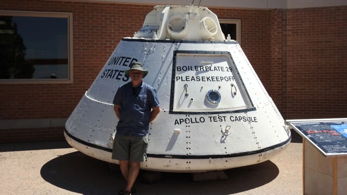 Od lat podróżuje tam, gdzie Księżyc zasłania Słońce. Jarosław Pióro widział już na świecie sześć zaćmień Słońca i wciąż planuje kolejne. Mówi, że 2026 i 2027 r. dla miłośników zjawisk astronomicznych będą wyjątkowe. „Jedno zaćmienie będzie dość blisko, drugie potrwa rekordowo długo”. (Na zdjęciu: Jarosław Pióro na tle kapsuły testowej programu Apollo, który doprowadził do lądowania człowieka na Księżycu, fot. materiały prywatne)