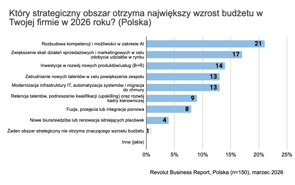Gdybyśmy zapytali zarządy europejskich firm, na co przeznaczą największy budżet w 2026 roku, odpowiedzi byłyby zaskakująco różne - i wiele mówiące o tym, jak poszczególne kraje patrzą na przyszłość. Revolut Business zlecił takie badanie firmie Censuswide i zebrał odpowiedzi od 1350 członków zarządów z 9 krajów, w tym 150 z Polski.