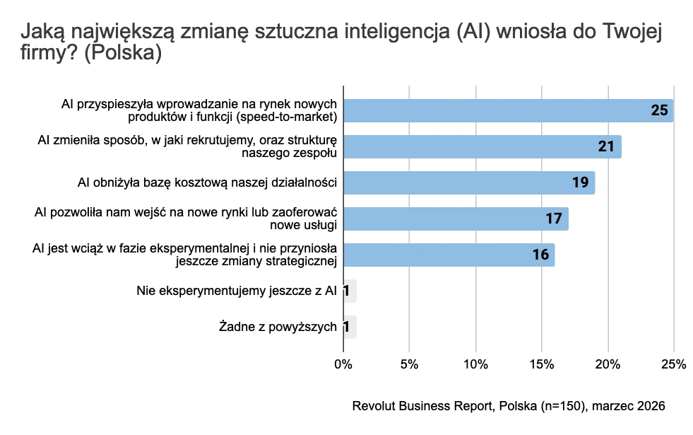 Co trzecia polska firma odczuła też zmiany w sposobie rekrutacji i strukturze zespołu (21 proc.). Zaledwie 1 proc. przyznaje, że w ogóle nie eksperymentuje z AI. Dla porównania - w całej Europie 22 proc. zarządów twierdzi, że jest zbyt wcześnie na ocenę efektów AI. Polskie firmy są tu wyraźnie do przodu.