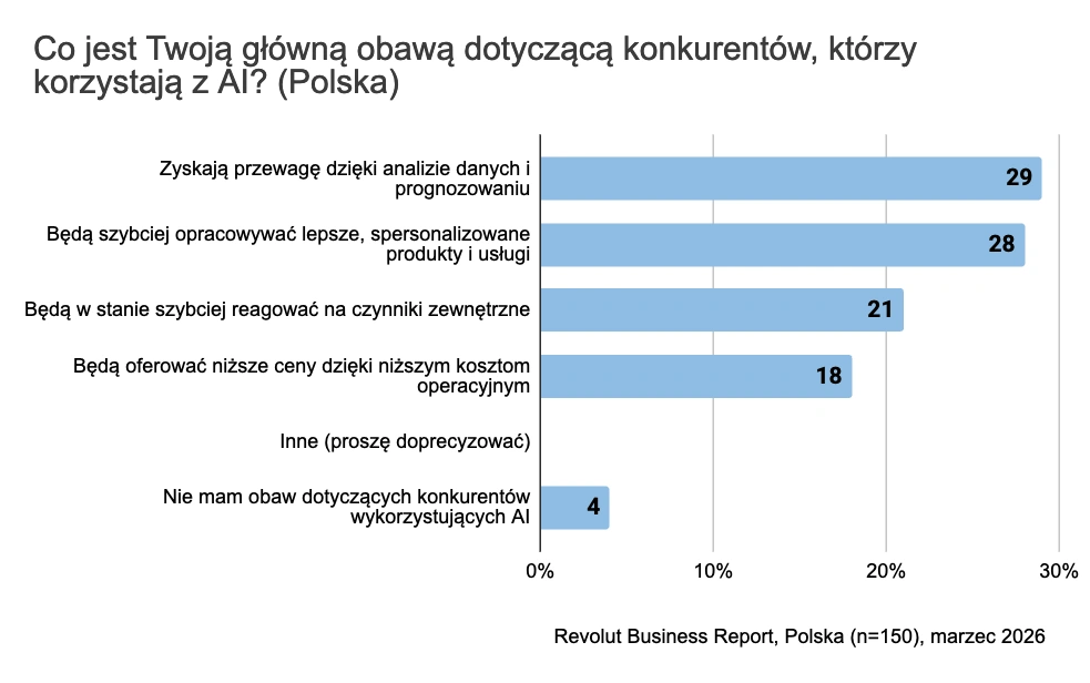 Największy strach? To, że konkurencja zdobędzie przewagę dzięki lepszej analizie danych i prognozowaniu - obawia się tego aż 29 proc. badanych, najwyższy wynik w Europie. Tuż za tym: obawa, że rywale będą tworzyć bardziej spersonalizowane produkty (28 proc.).