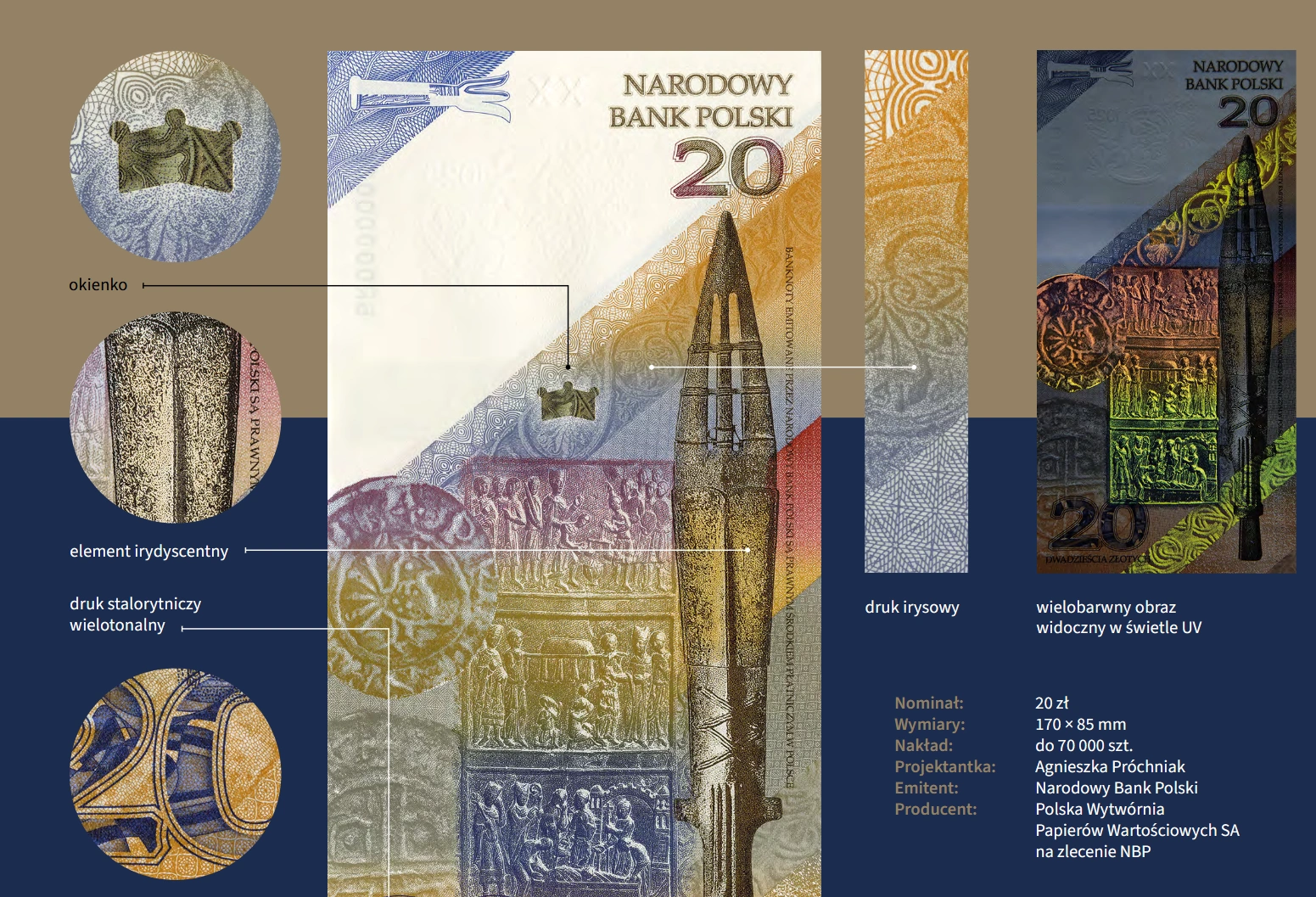 Twórcy zadbali również o warstwę technologiczną. Banknot zawiera zaawansowane zabezpieczenia – od mikrotekstów po elementy widoczne w świetle UV.