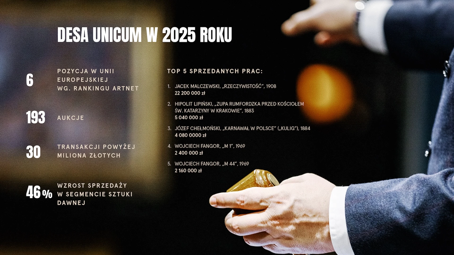 DESA Unicum podsumowuje 2025 rok polskiego rynku sztuki. Był to czas dojrzałości, milionowych rekordów i 46 proc. wzrostu w segmencie sztuki dawnej. Promocja twórczości kobiet oraz młodych talentów potwierdza, że polski rynek na dobre dołączył do europejskiej czołówki.