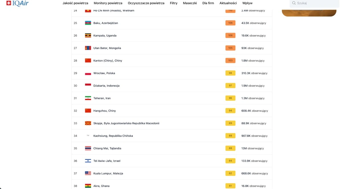 Zestawienie z 2 grudnia otwiera Lahaur (Pakistan), które wyprzedza na podium indyjskie Delhi i Kalkutę. A które miejsce zajmuje w tej brudnej tabeli pierwszy reprezentant Europy? Okazuje się, że jest to Wrocław, który w skali globalnej plasuje się na 29. miejscu, ale na Starym Kontynencie pod względem kiepskiej jakości powietrza nie ma sobie równych na początku grudnia. Kolejni przedstawiciele Europy sklasyfikowani byli na 33. miejscu jest Skopje (Macedonia Północna), na 41. Belgrad (Serbia), na 47. Zagrzeb (Chorwacja), na 48. Sarajewo (Bośnia i Hercegowina), na 50. Mediolan (Włochy), na 51 Lublana (Słowenia), a na 52. kolejny reprezentant Polski - Kraków.