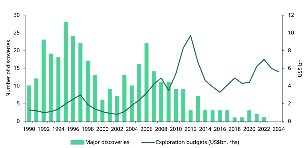 Dlaczego tak się nie dzieje? Powód jest prosty. Odkrywanie nowych złóż jest coraz trudniejsze, a ich eksploatacja wymaga gigantycznych pieniędzy. Liczba dużych odkryć spadła do najniższych poziomów od wielu dekad, mimo że budżety na poszukiwania należą do najwyższych w historii.
