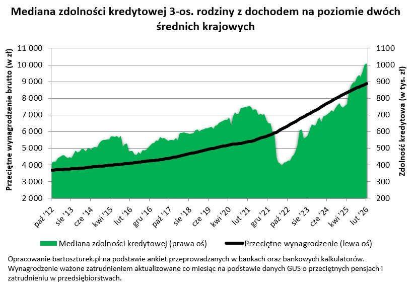 Wspomniana kwota zdolności kredytowej, na którą może liczyć trzyosobowa rodzina dysponująca dwiema średnimi krajowymi (ponad 1 mln zł), to mediana. To znaczy, że połowa instytucji deklaruje chęć pożyczenia przykładowej rodzinie większej kwoty, a połowa mniejszej - szacuje analityk rynku nieruchomości.