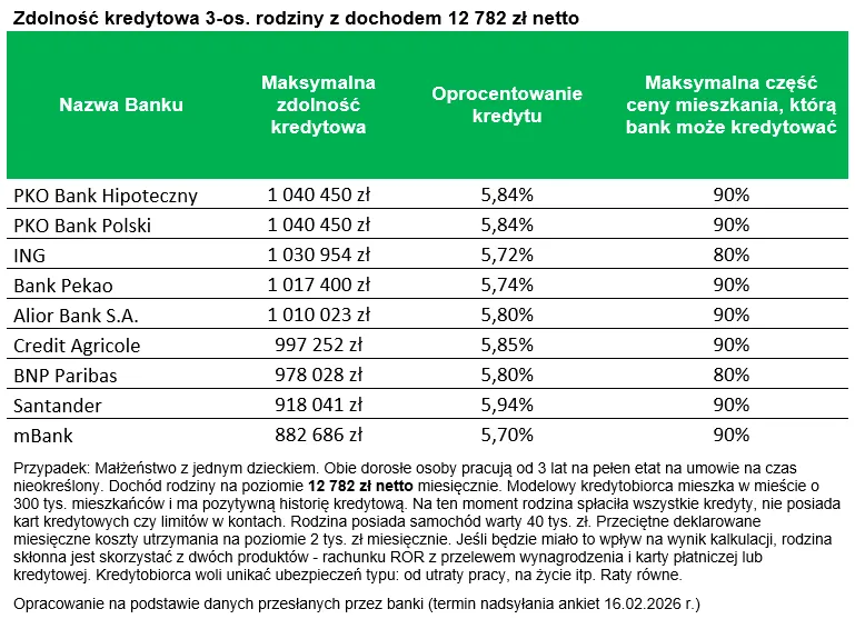 I odkreśla, że przesłane przez banki dane sugerują, że nawet instytucje szacujące zdolność kredytową najbardziej zachowawczo, deklarują możliwość pożyczenia rodzinie z naszego przykładu około 900 tys. zł. Taką ofertę przedstawiły mBank i Santander. Mało tego, w kilku instytucjach deklaracje ocierają się albo nawet przekraczają już 1 mln zł. Takie propozycje zadeklarowały BNP Paribas, Credit Agricole, Alior, Pekao, ING i PKO BP wraz ze swoim bankiem hipotecznym.