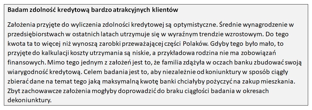 I dodaje, że w efekcie, choć banki deklarują chęć pożyczenia na zakup mieszkania najwyższej kwoty w historii, to bywały już czasy, kiedy zdolność kredytowa była liczona tak liberalnie, że przy obecnym poziomie dochodów banki pozwoliłyby zadłużyć się nawet na 30 proc. więcej.