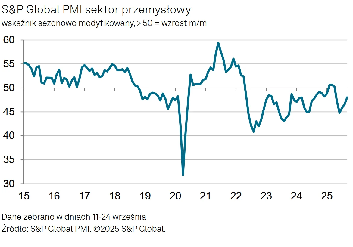 Wskaźnik PMI dla sektora wytwórczego wzrósł z 46,6 pkt w sierpniu do 48,0 pkt, co jest najwyższym wynikiem od kwietnia. Choć nadal pozostaje poniżej granicy 50 pkt, oddzielającej wzrost od spadku, to trzeci miesiąc z rzędu notuje zwyżkę, sygnalizując spowolnienie tempa pogorszenia sytuacji.