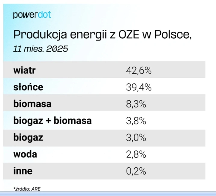 W Polsce według danych ARE największy udział w produkcji energii z OZE mają farmy wiatrowe, które dostarczyły 43 proc. zielonego prądu w okresie styczeń-listopad 2025 roku. Na drugim miejscu znalazły się farmy fotowoltaiczne z udziałem na poziomie 39 proc. Na kolejnych pozycjach uplasowali się producenci energii z biomasy (8 proc.), spalarnie biomasy i biogazu (4 proc.) oraz samego biogazu (też 3 proc.), a także elektrownie wodne.