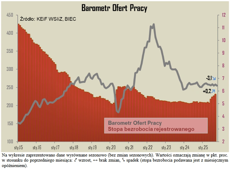 Zestawienie Barometru Ofert Pracy ze zmianami bezrobocia pokazuje, że wchodzimy w mniej komfortową fazę cyklu – ofert nie przybywa, za to rośnie liczba osób ich szukających. To zła wiadomość dla osób, które liczyły, że bez wysiłku znajdą lepiej płatną pracę, ale sygnał ostrzegawczy dla całej gospodarki, która do tej pory bazowała na bardzo napiętym rynku pracy.