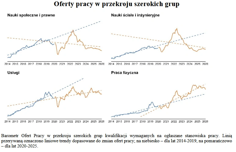Z danych badania BIEC wynika, że redukcja ofert miała charakter powszechny. Obejmowała wszystkie grupy zawodowe. Najmocniej ucierpiały zawody fizyczne oraz wymagające wykształcenia ścisłego lub inżynieryjnego. W usługach spadki były płytsze, ale również widoczne.