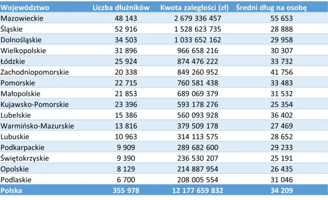 Problem zadłużenia seniorów nie rozkłada się równomiernie po kraju, w niektórych regionach osiąga skalę, która drastycznie odbiega od średniej krajowej. Bezapelacyjnie najbardziej obciążeni są seniorzy z województwa mazowieckiego. To właśnie tam notowana jest najwyższa łączna kwota zaległego zobowiązania na osobę, wynosząca 55,7 tys. zł.