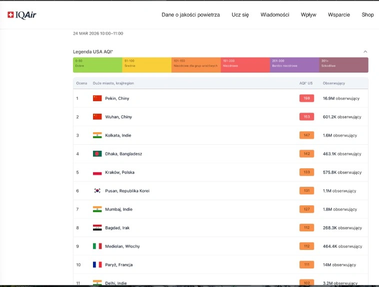 Przed godz. 12 doszło do małego przetestowania. Wrocław spadł na 30. lokatę, Warszawa plasowana była wtedy na 25. miejscu. Wybił się za to Kraków, który okazał się piątym dużym miastem na świecie z najbrudniejszym powietrzem. W Europie gród Kraka nie miał sobie pod tym względem równych. Następnych przedstawicieli Starego Kontynentu: Mediolan i Paryż sklasyfikowano odpowiednio na 9. i 10. lokacie.