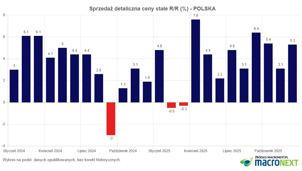 Odrobinę słabiej od konsensusu, ale wciąż z wysokim wzrostem – tak kończymy 2025 rok na krajowej sprzedaży detalicznej. Patrząc na indeks można dojść do wniosku, że pod koniec ubiegłego roku zrodziło się pewne ożywienie – podkreślają ekonomiści mBanku.