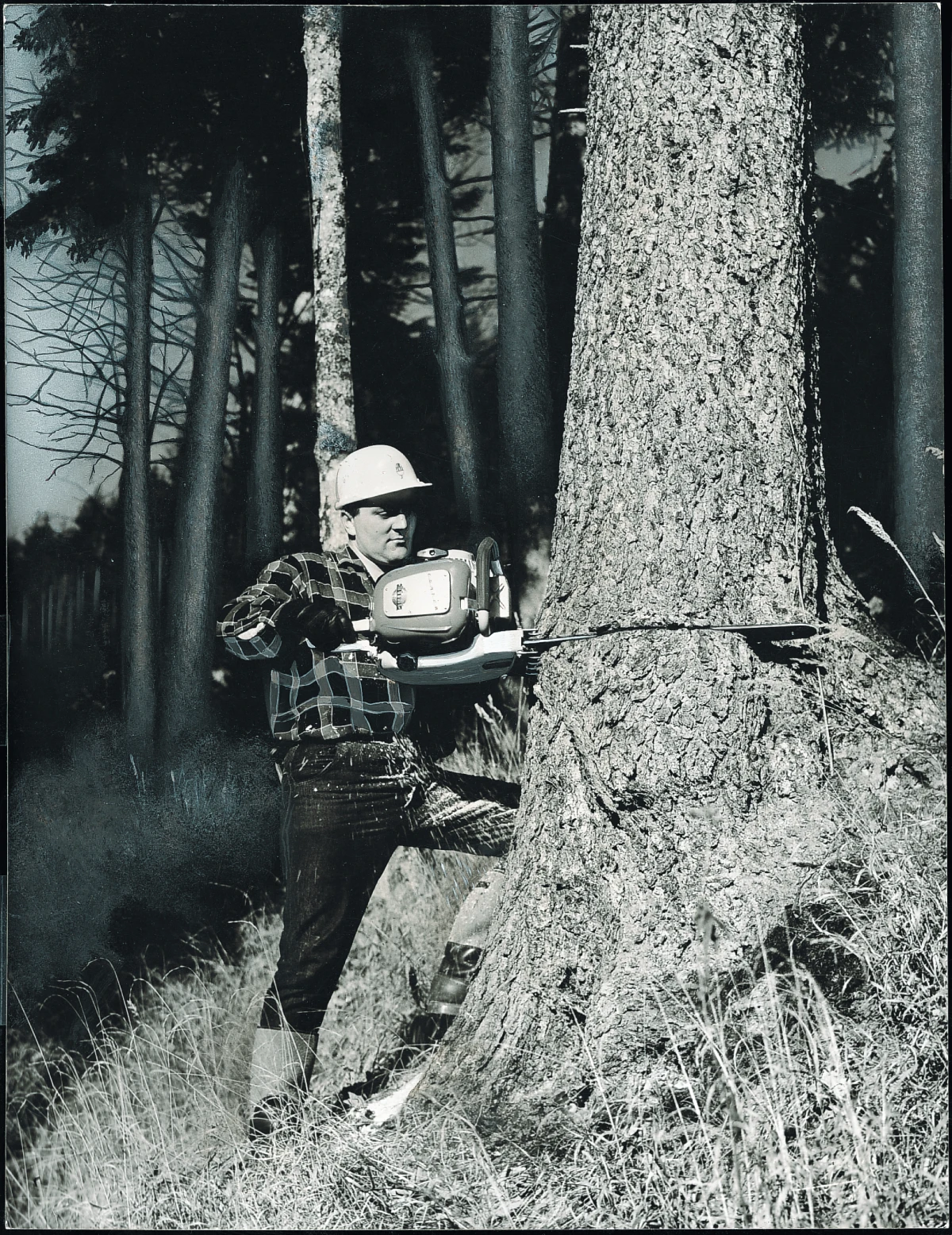 Dwóch mężczyzn mocuje się z jakimś żelastwem. Rękawy podwinięte, dłonie śliskie od mżawki mi smaru, buty zapadają się w miękkiej ziemi. Powoli zsuwają z wozu maszynę ważącą prawie 50 kilogramów. Obok stoi grupka drwali. Patrzą z niedowierzaniem. Inni z rozbawieniem. Za chwilę coś ma przeciąć pień szybciej niż piła ręczna i skuteczniej niż siła ludzkich ramion.