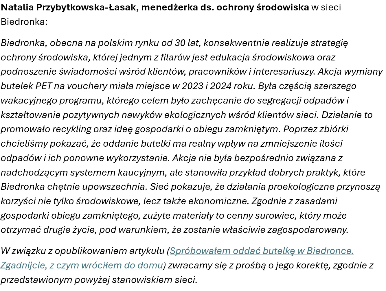 I faktycznie: Biedronka informuje o akcji sprzed roku „Do Biedronki idę!”, w ramach, której można było wymienić butelki plastikowe po napojach na voucher, ale z ograniczeniem czasowym. Bo jak się okazuje akcja była ograniczona czasowo: od 3 sierpnia do 11 września 2024 r.
