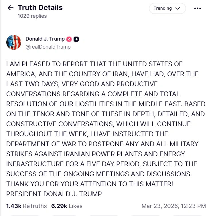 „Z przyjemnością informuję, że Stany Zjednoczone Ameryki oraz Iran prowadziły w ciągu ostatnich dwóch dni bardzo dobre i owocne rozmowy dotyczące całkowitego i zupełnego zakończenia wzajemnej wrogości na Bliskim Wschodzie. Opierając się na wydźwięku i tonie tych głębokich, szczegółowych i konstruktywnych rozmów, które będą kontynuowane przez cały tydzień, poleciłem Departamentowi Wojny odroczenie wszelkich uderzeń militarnych na irańskie elektrownie i infrastrukturę energetyczną na okres pięciu dni, pod warunkiem pomyślnego przebiegu trwających spotkań i dyskusji. Dziękuję za uwagę w tej sprawie! Prezydent Donald J. Trump” – napisał Donald Trump.