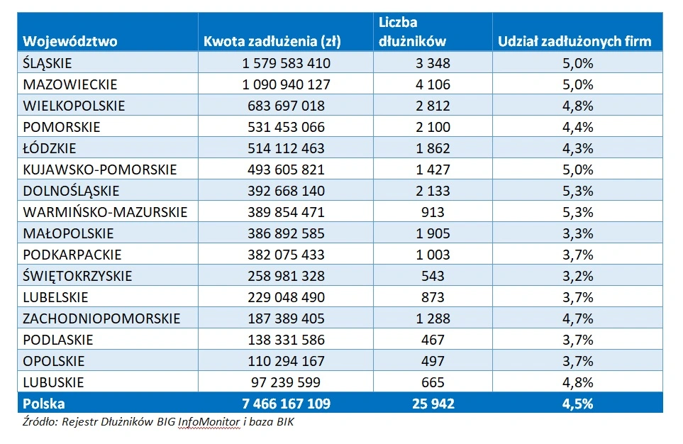 Najmniejszym obciążeniem charakteryzują się natomiast woj. lubuskie (97,2 mln zł) i opolskie (110,3 mln zł), gdzie zadłużenie jest ponad dziesięciokrotnie niższe niż w centrum i na Śląsku. Dane jasno pokazują, że problemy finansowe firm produkcyjnych koncentrują się przede wszystkim w najbardziej uprzemysłowionych województwach.