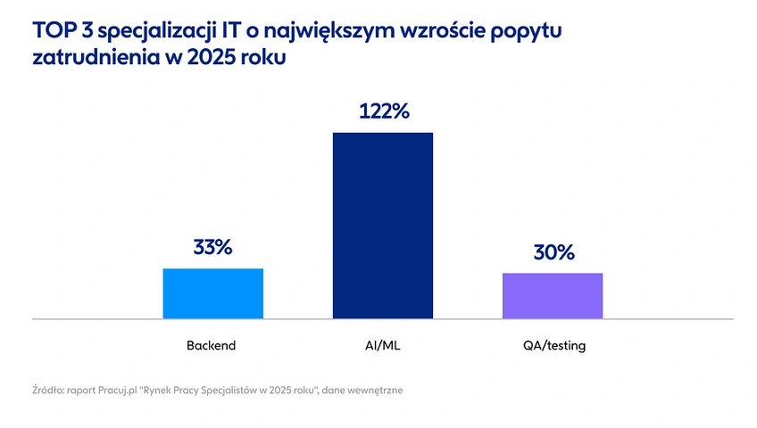 Wzrost liczby ofert w IT nie rozlał się równomiernie po całym rynku. Największą dynamikę zanotowały specjalizacje bezpośrednio związane z tworzeniem i wdrażaniem technologii. W obszarze AI i machine learning liczba ogłoszeń wzrosła aż o 122 proc. rok do roku. Wyraźne wzrosty widać też w backendzie, gdzie popyt zwiększył się o 33 proc., oraz w QA i testach – o 30 proc.