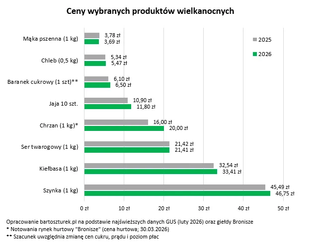 Według niego bardzo prawdopodobne, że w tym roku więcej zapłacimy też za cukrowe baranki, bo choć cukier jest dziś tańszy niż przed rokiem, to inne składniki ceny wielkanocnych baranków (m.in. wynagrodzenia czy prąd) są droższe niż przed rokiem.