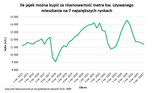 Co się zmieniło? Już od kilku kwartałów mamy do czynienia ze stabilizacją cen mieszkań, podczas gdy wiele produktów spożywczych w tym jajka wyraźnie zdrożały. Warto podkreślić, że do obliczeń przyjęto najświeższe dostępne dane NBP na temat cen faktycznie płaconych za mieszkania. Te są niestety publikowane z opóźnieniem. Najświeższe wstępnie podsumowują 4 kwartał 2025 roku - komentuje Bartosz Turek.