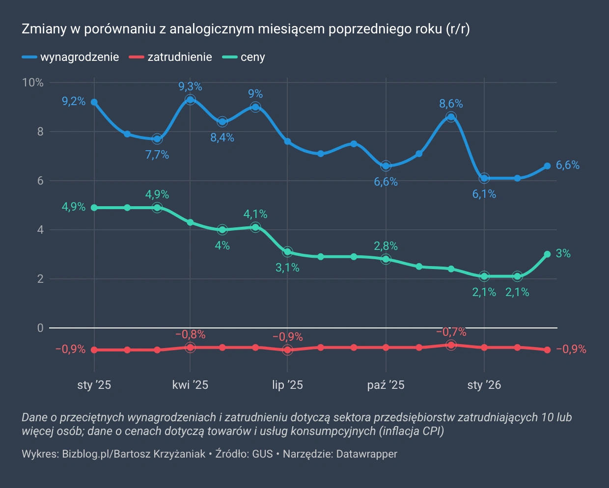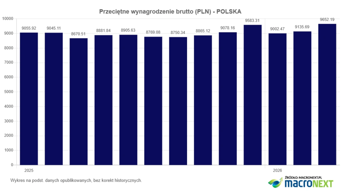 Przeciętne wynagrodzenie w sektorze przedsiębiorstw w marcu 2026 r. wyniosło 9652,19 zł brutto, osiągając najwyższy poziom w historii. Tłumacząc przyczyny wzrostu, GUS podaje w komunikacie standardową formułkę, którą możemy znaleźć we wszystkich wcześniejszych publikacjach: