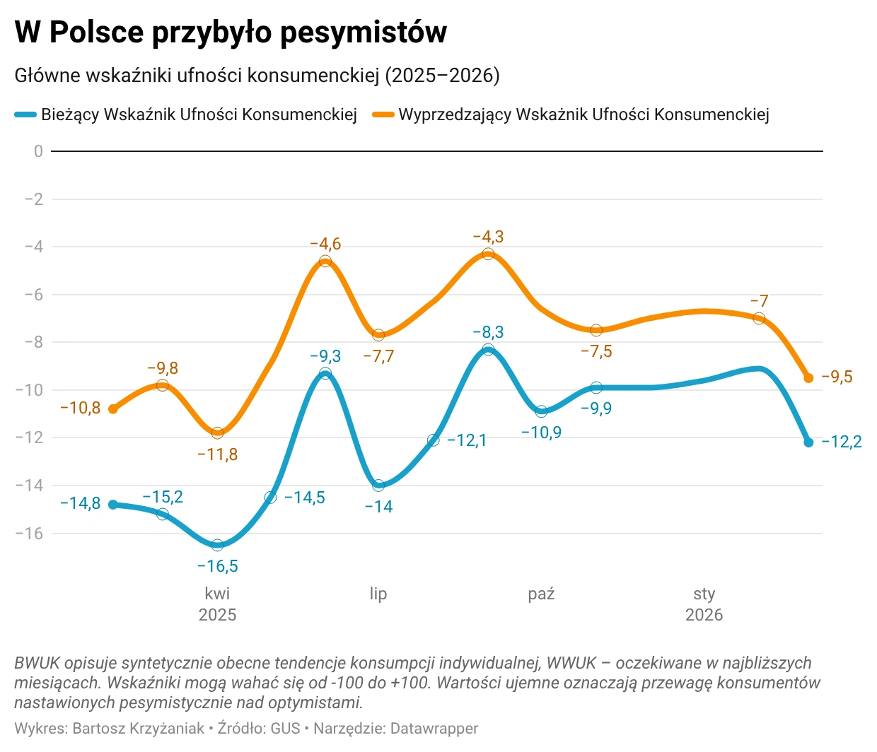 Oceny sytuacji ekonomicznej Polski – zarówno przyszłej (-10,2 p. proc.), jak i obecnej (-2,8 p. proc.).