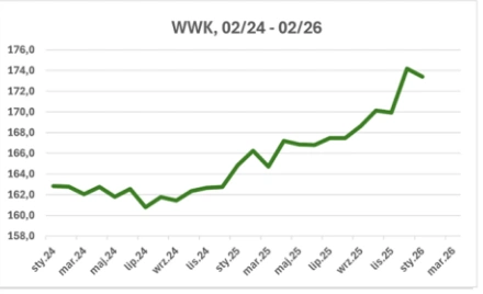 W lutym 2026 r. Wskaźnik Wyprzedzający Koniunktury (WWK), publikowany przez BIEC, obniżył się o 0,6 pkt w stosunku do stycznia. Skala spadku nie jest duża, zwłaszcza na tle wcześniejszych wzrostów. Problem w tym, że struktura wskaźnika pokazuje utrwaloną słabość popytu w przemyśle.