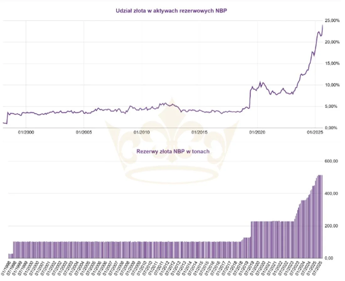 NBP zapowiedział kilka tygodni temu, że zwiększa udział złota w aktywach rezerwowych do 30 proc. W pierwszej połowie 2025 r. należeliśmy do największych nabywców kruszcu na świecie, a stan posiadania przekroczył 520 ton (ok. 25 proc. rezerw). Za kilka dni – na początku listopada – bank centralny pokaże nowe dane, które pokażą tempo dojścia do celu.